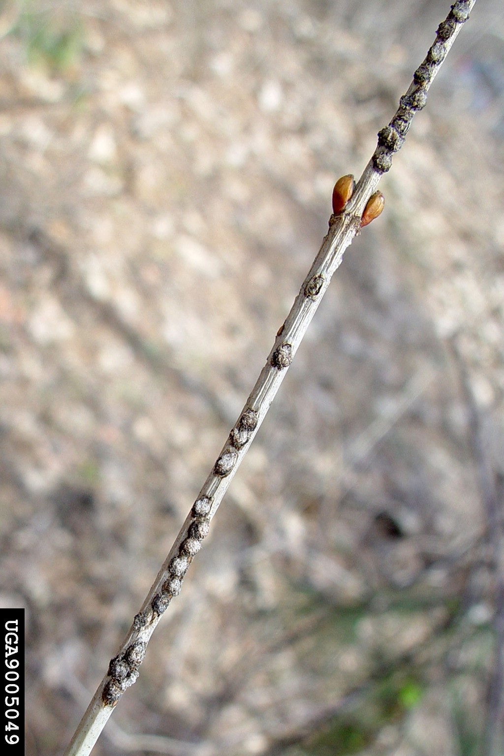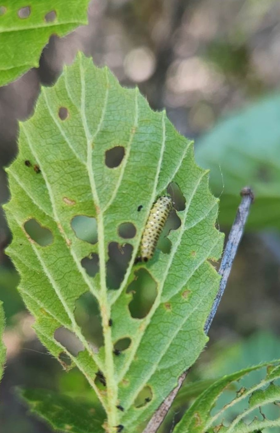Beetles winter as eggs on stems. Eggs hatch in May into green larvae that skeletonize leaves. In late June and early July larvae will drop to the ground and pupate. About 10 days later in mid July adults will emerge and feed on leaves. Adults continue to feed on leaves for the remainder of the summer until frost and will lay eggs on twigs. Beetles are common in the North Eastern states, but rare in IL, MI, OH.