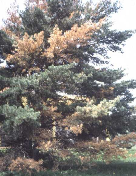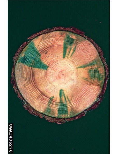 All needles on the affected branches die and turn brown at about the same time. Eventually the tree will succumb to the disease and all of the needles will turn brown. Pine sawyer beetles may be observed feeding or laying eggs on the pine trees. If a dead branch is pruned away, bluish staining may be observed in the wood. This is caused by a fungus, also transmitted by the pine sawyer beetle, that the nematodes feed on. These symptoms resemble those of fungal diseases or may be confused with winter or freeze injury. Send samples to a plant disease diagnostic lab for confirmation.