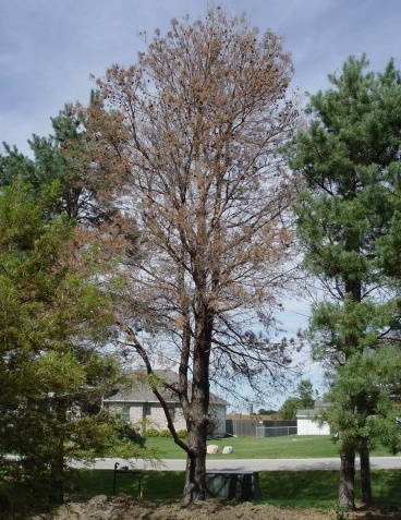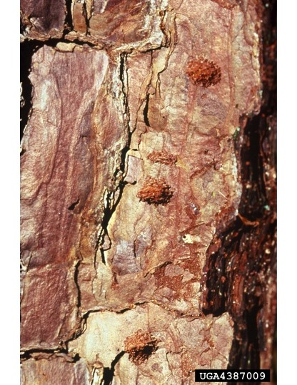 Pine wilt is a complex disease caused by nematodes that are transmitted to the trunk and branches by pine sawyer beetles. A fungus associated with wilting may also be involved in this disease. The nematodes make their way to the vascular tissue through feeding wounds or by following tunnels formed by pine sawyer beetle larvae. Destruction caused by the feeding nematodes kills the associated branch. Pine sawyer beetles also lay their eggs on dead wood. While this will not cause immediate harm to the landscape, more beetles and nematodes will emerge the following year which increases the risk to living pines.