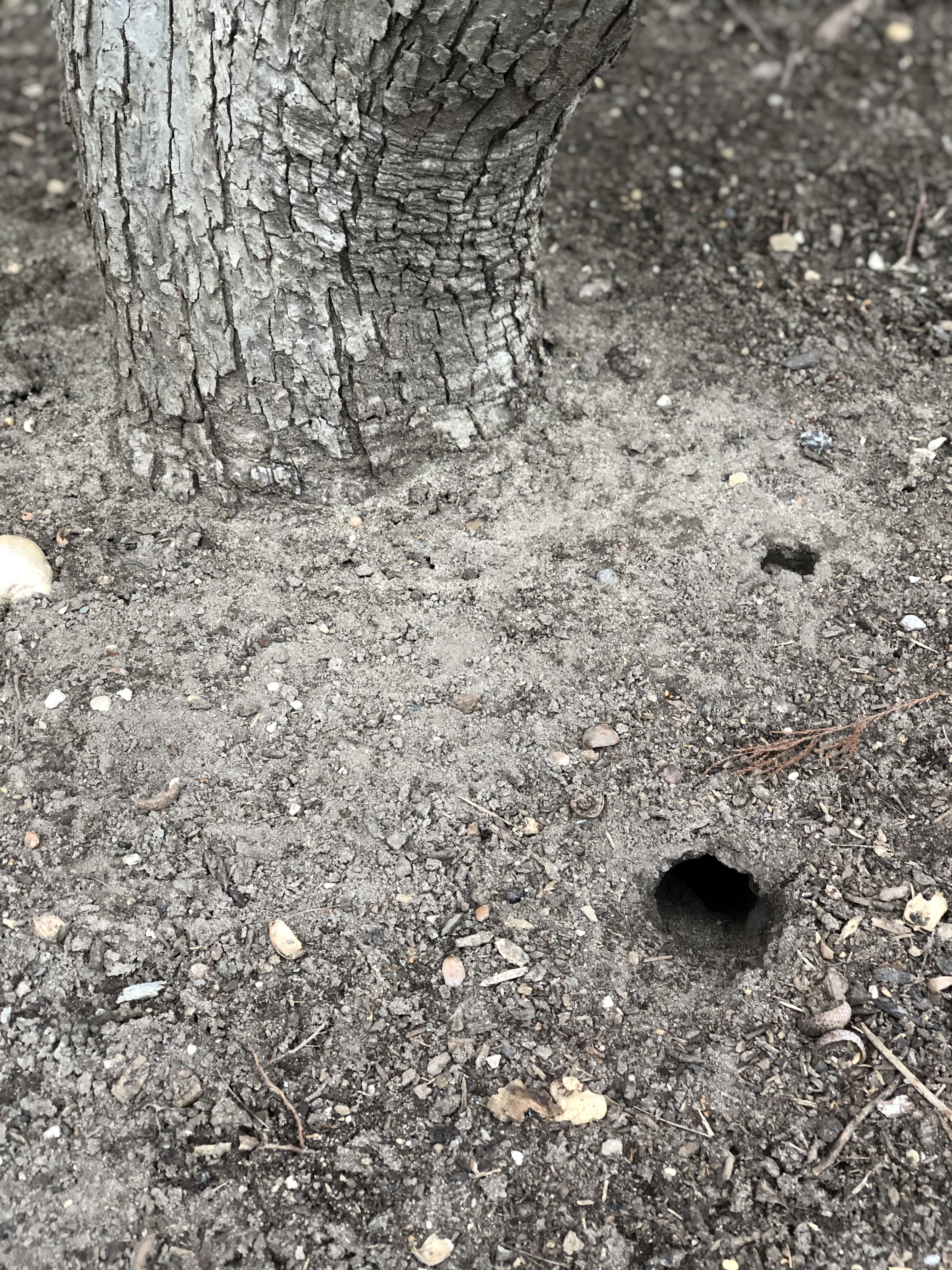 Rodent and other small animal damage occurs within 10 inches of the ground while deer browse and rubbing will reach to over 5 feet. Common symptoms include branch bark peeled back by squirrels, and girdling (a chewed ring of bark and wood around the trunk) caused by mice and voles. Rabbits (not rodents but lagomorphs) also cause similar types of basal damage. For vole damage, look for lines of disturbed soil leading to shrubs. Gophers and pocket gophers leave mounds of soil near damaged shrubs. Gophers and pocket gophers cut roots of shrubs and vines along with gnawing bark. Both gophers and pocket gophers destroy the roots of plants beneath the surface and then pull the plant into the burrow. Voles eat shrubs, including their roots. Their runways and tunnels cause root damage. They are particularly harmful to the roots of boxwoods. During winters with heavy snowfall, voles will tunnel through the snow to eat bark and evergreen leaves. Voles will also use mole tunnels to feed on plant roots. Voles may cause extensive damage to orchards and woody landscape plants in the winter when they girdle (or chew) the bark from the lower trunks.