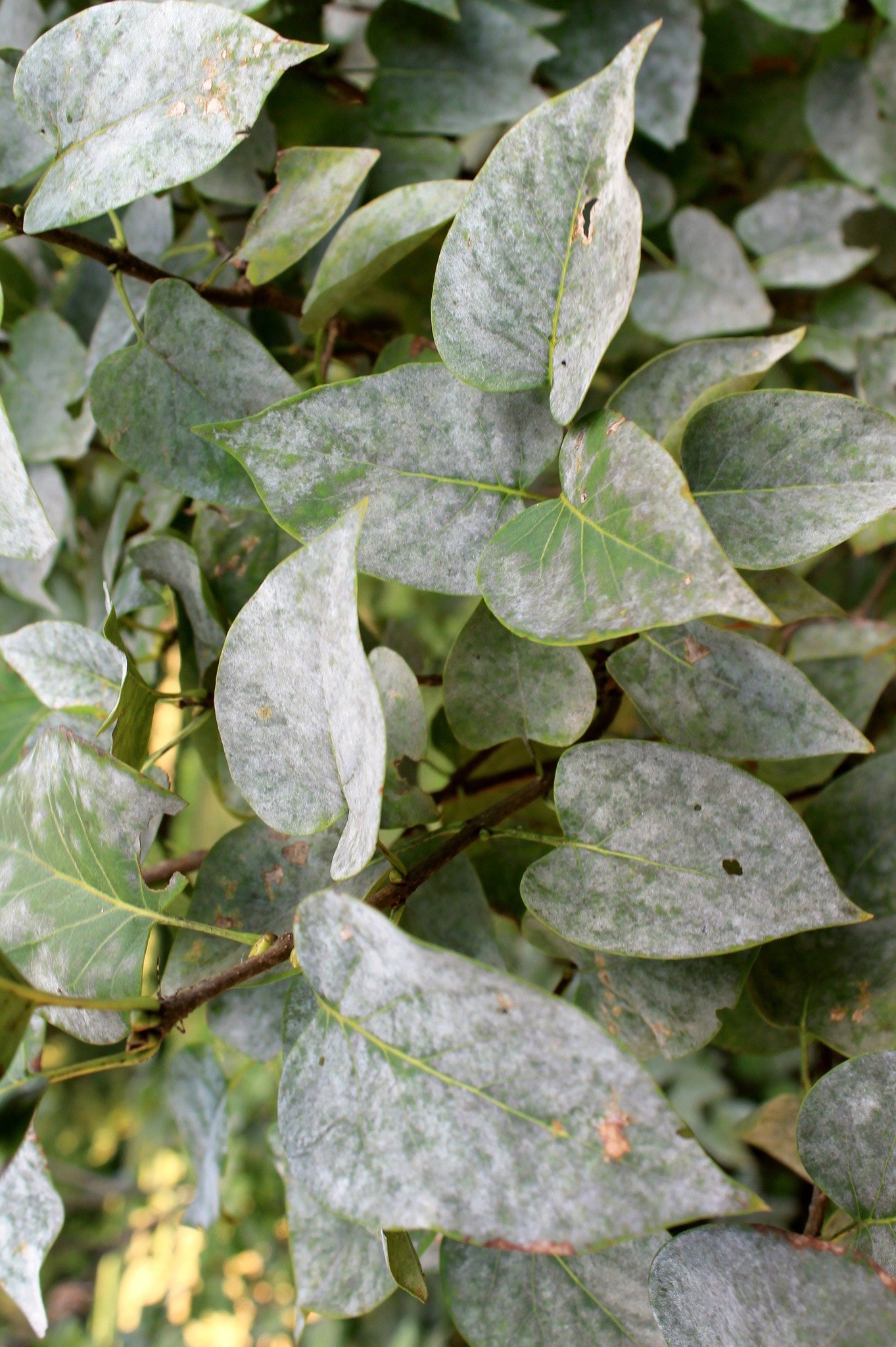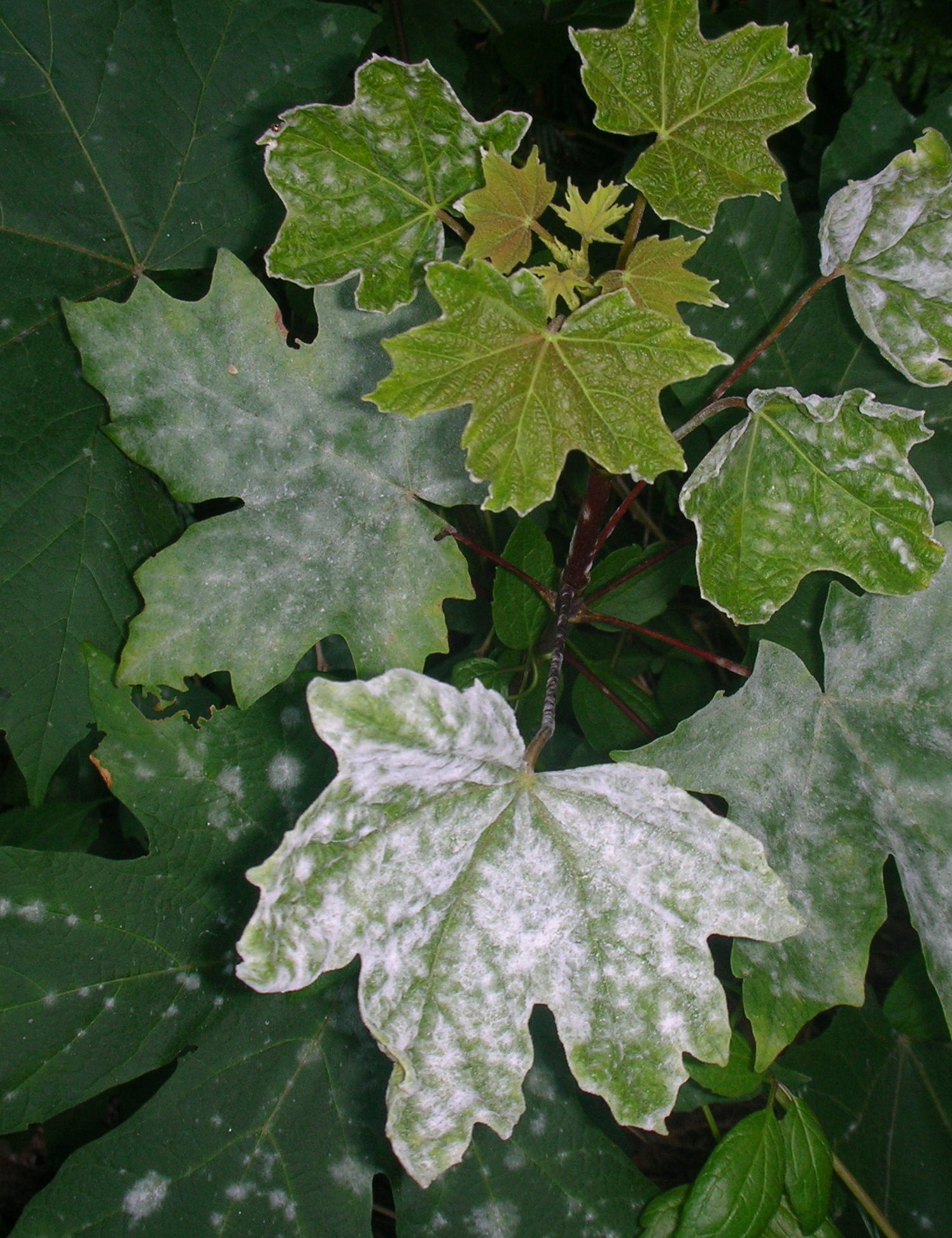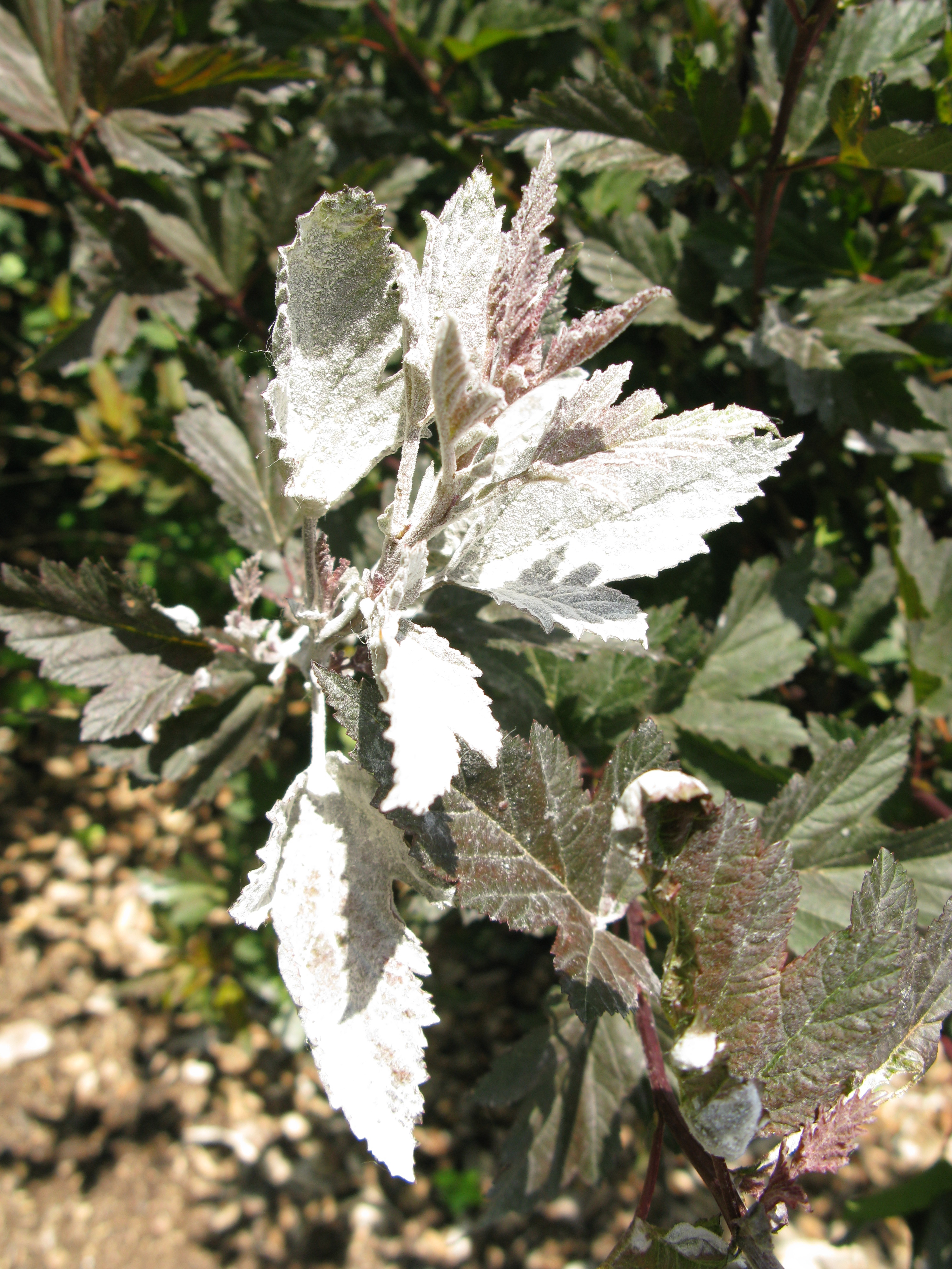 Powdery mildews are some of the most commonly encountered fungal diseases on ornamental plants. Powdery mildew is easily diagnosed by the characteristic powdery, white coating of fungi that covers infected leaves. Dark brown dead spots may form in the center of white covered tissue. Powdery mildew rarely causes serious damage to its host, but infection can produce discolored leaves that die or drop, disfigured shoots, and deformed flowers. Although ugly, powdery mildew is rarely fatal. The distinction between powdery and downy mildew is important as the fungicides effective against one are not usually effective against the other.