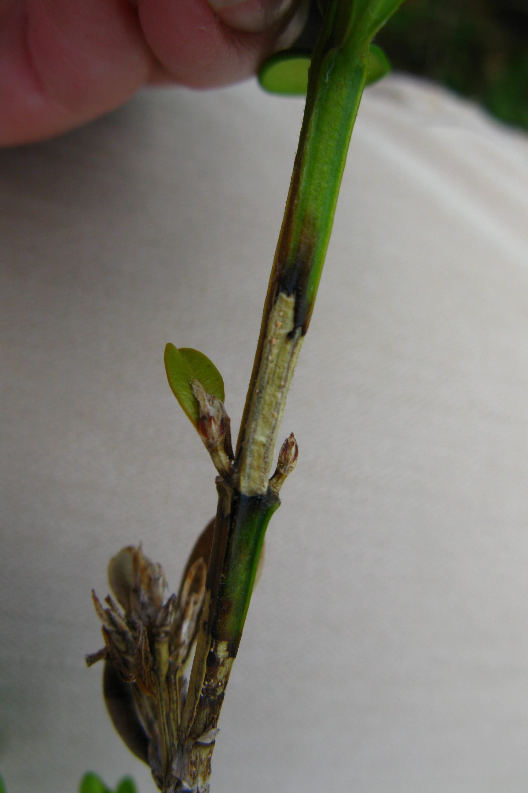 Symptoms of Volutella blight begin as small, dead leaf and stem spots. Leaf spots expand and may kill the entire leaf. Concentric rings can be seen within the leaf spots. Stem spots develop into blackened, sunken, girdling (fully encircling the stem) cankers. Small clumps of white to pink spores develop on canker surfaces when stems are damp or humidity is high.