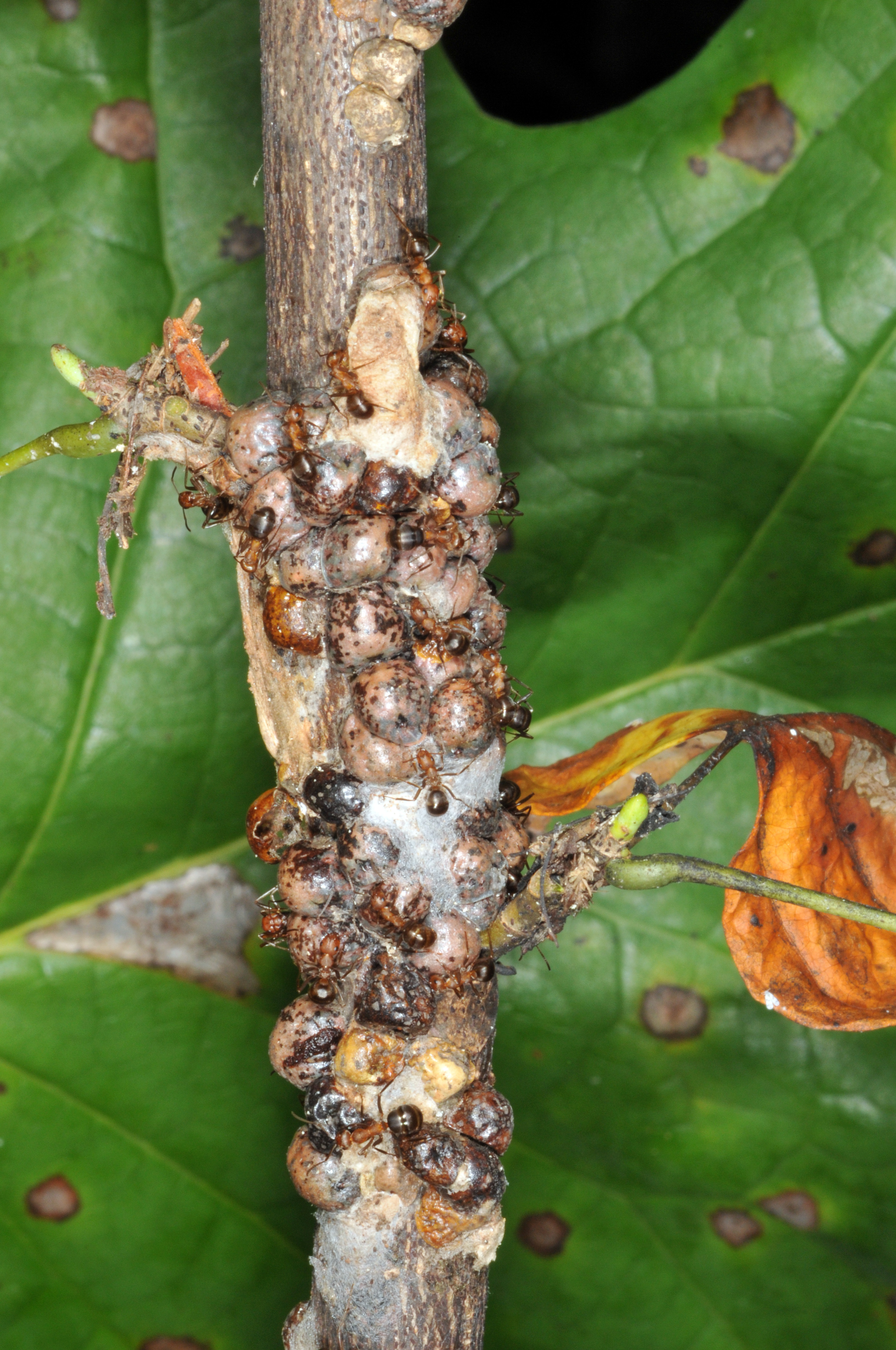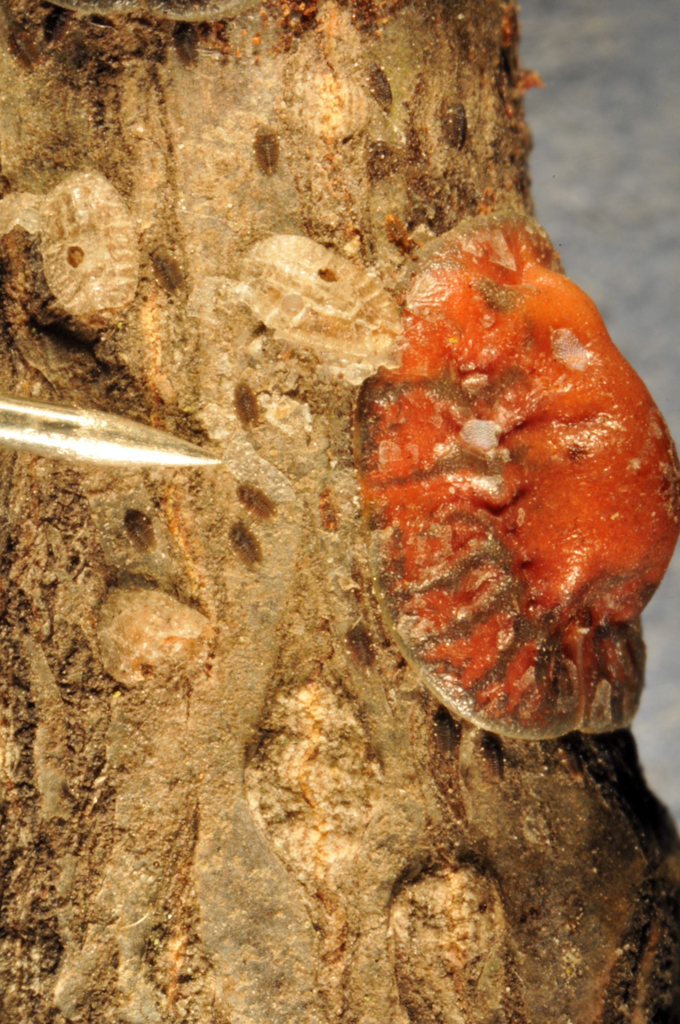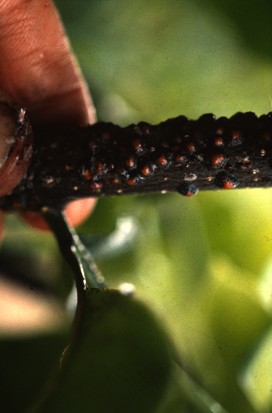Trees infested with tuliptree scales have twigs crusted with large, orange-brown female scales up to 3/8" in diameter. Scales produce a sticky excrement called honeydew than can coat leaves and branches, turning them black with an unsightly sooty mold. Honeydew begins to accumulate significantly after females mate with males in mid-June and continues throughout the summer and may cause a nuisance by attracting stinging wasps. Heavy accumulations of honeydew and sooty mold can kill branches. All stages of this scale can be separated from the plant tissue by flipping them over with a fingernail. This flipping process will not rip the plant surface. If you remove a bump on a plant and the tissue rips, this means the plant has produced a gall or swelling in response to an insect or disease and is not a scale insect. On tulip-poplars the honeydew from aphids can cause similar problems, so be sure to compare the what you see with the Pest Detail for aphids. Similarly, on magnolias, be sure to compare with the Pest Detail for magnolia scale because its honeydew can cause similar problems.