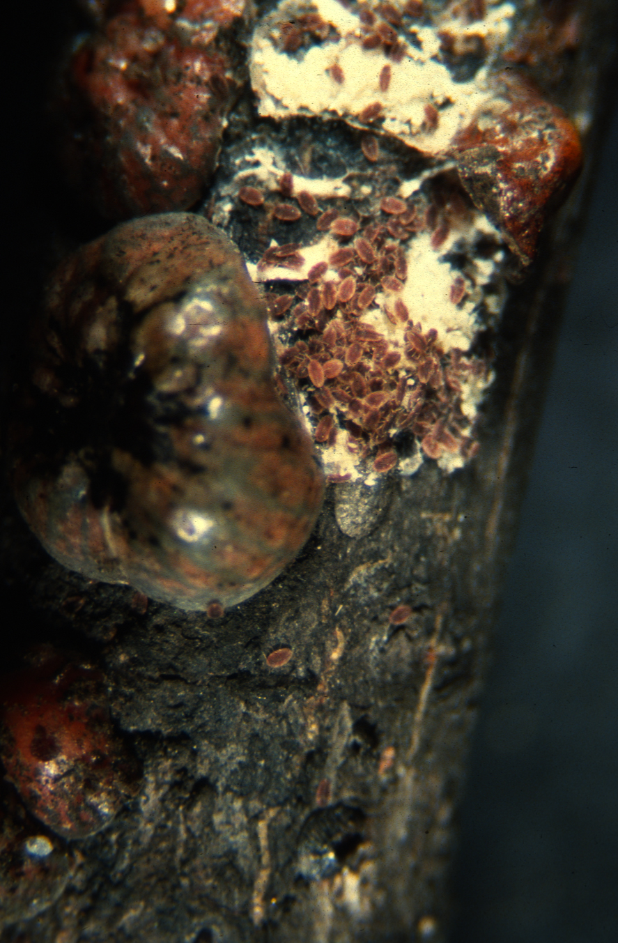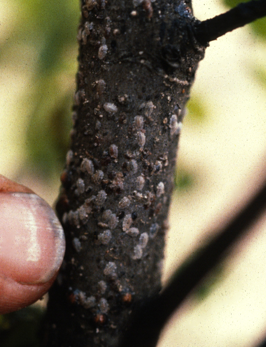 Wintering as immature scales on twigs, they resume feeding when the plant comes out of dormancy in the spring. Winged males emerge in June and mate with females. Females can produce over 3,000 eggs that hatch into black crawlers in late August and September. Crawlers migrate to and settle on stem. Immature scales winter on stems.