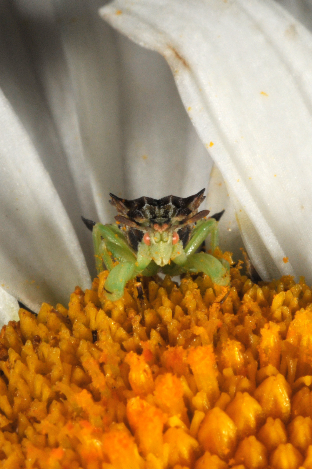 There are many species of ambush bugs. Each has a spear-like mouth tucked under their head that can be flipped forward to pierce the body of its prey and inject it with digestive enzymes. After the contents of its prey have been liquified, the ambush bug uses this spear-like mouth as a straw to suck out its insides. Eggs are laid in clusters that are stuck to leaves or flower buds. Nymphs hatch out of the eggs and begin preying upon other insects. The nymphal stage superficially resembles the adult stage, but is smaller in size and lacks functional wings.