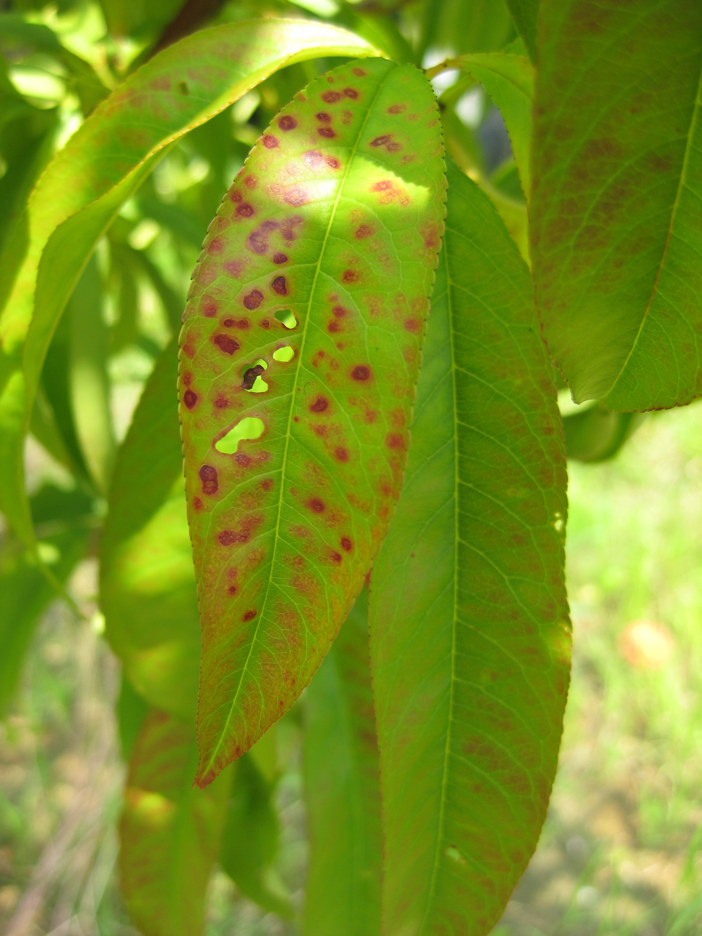 Holes in leaves resemble the injuries caused by an insect, but is commonly caused by a bacterium (and sometimes, a fungus). The infected leaf tissue falls out leaving a hole. In severe cases during wet springs, this disease can result in defoliation.